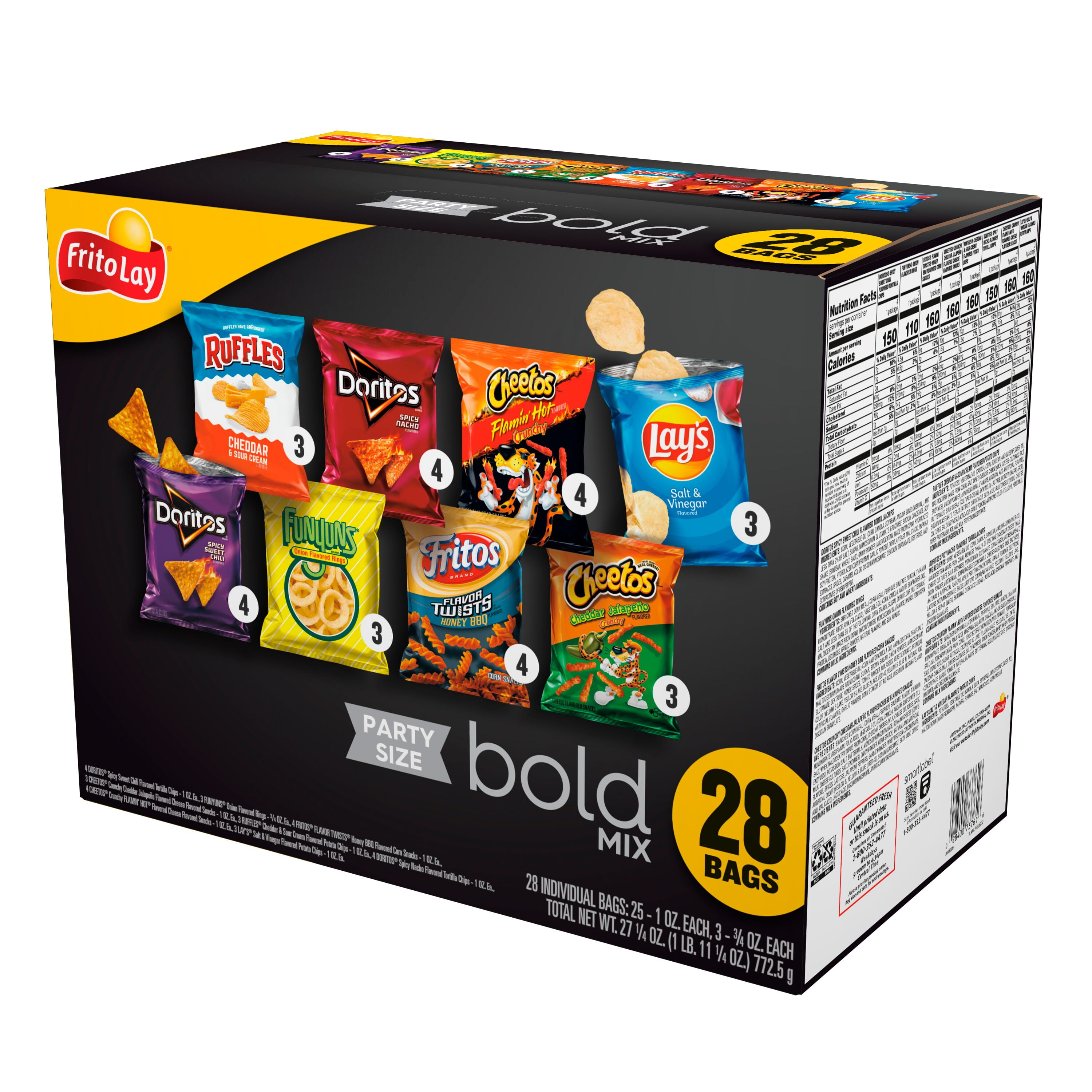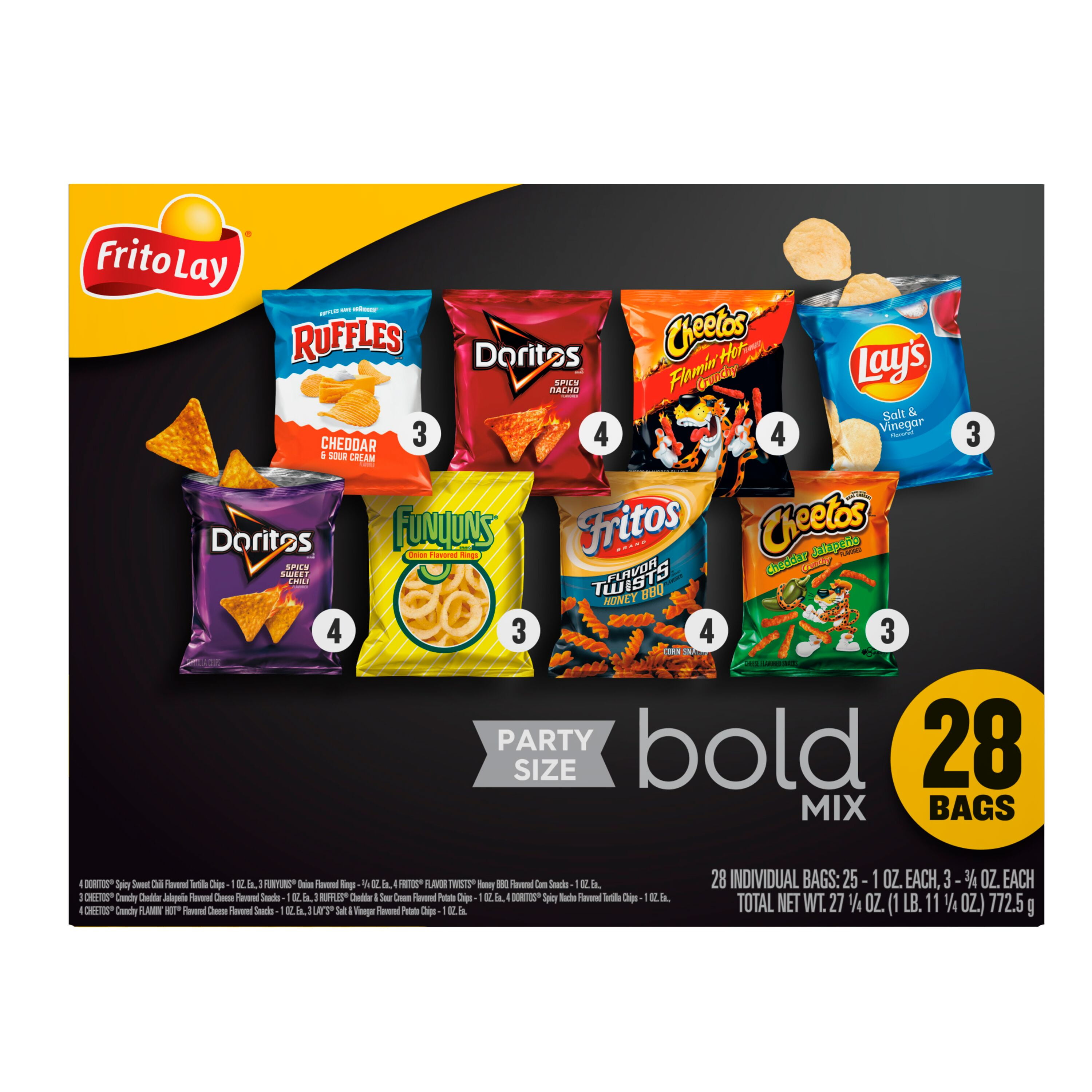 - Enjoy a 28 bags diverse assortment with the Frito-Lay Bold Mix, featuring a mix of popular snack chip types including Ruffles, Doritos, Cheetos, Lay's, Funyuns, and Fritos